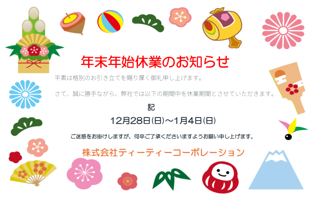 さて、誠に勝手ながら、弊社では以下の期間中を休業期間とさせていただきます。記